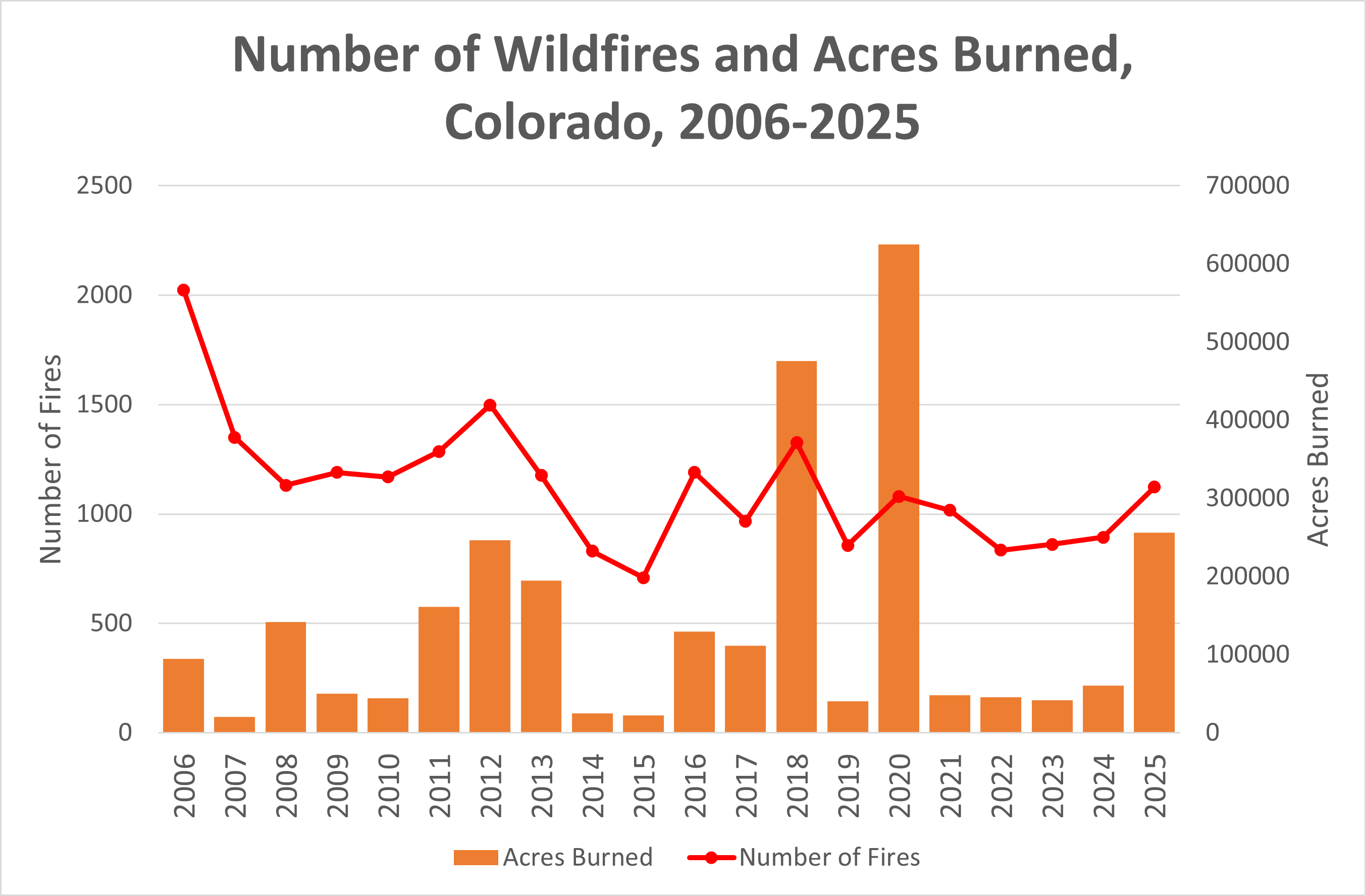Figure 3: Number of wildfires (red line) and number of acres burned (orange bars) per year in Colorado from 2006 to 2025. Data from NICC Annual Reports.