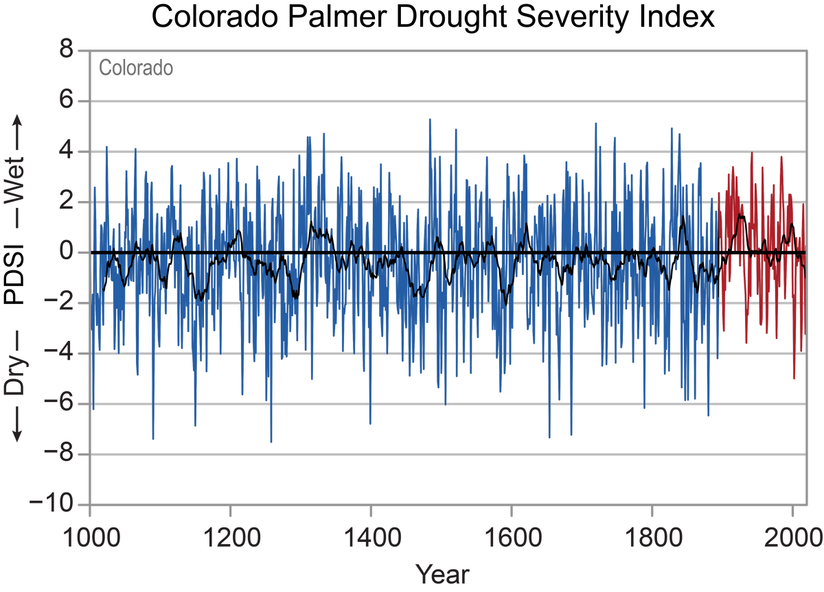 Recent drought is not historically unusual, as proxy data going back to the year 1000 show Colorado has experienced periods of severe and lasting drought in the past that was worse than today.8