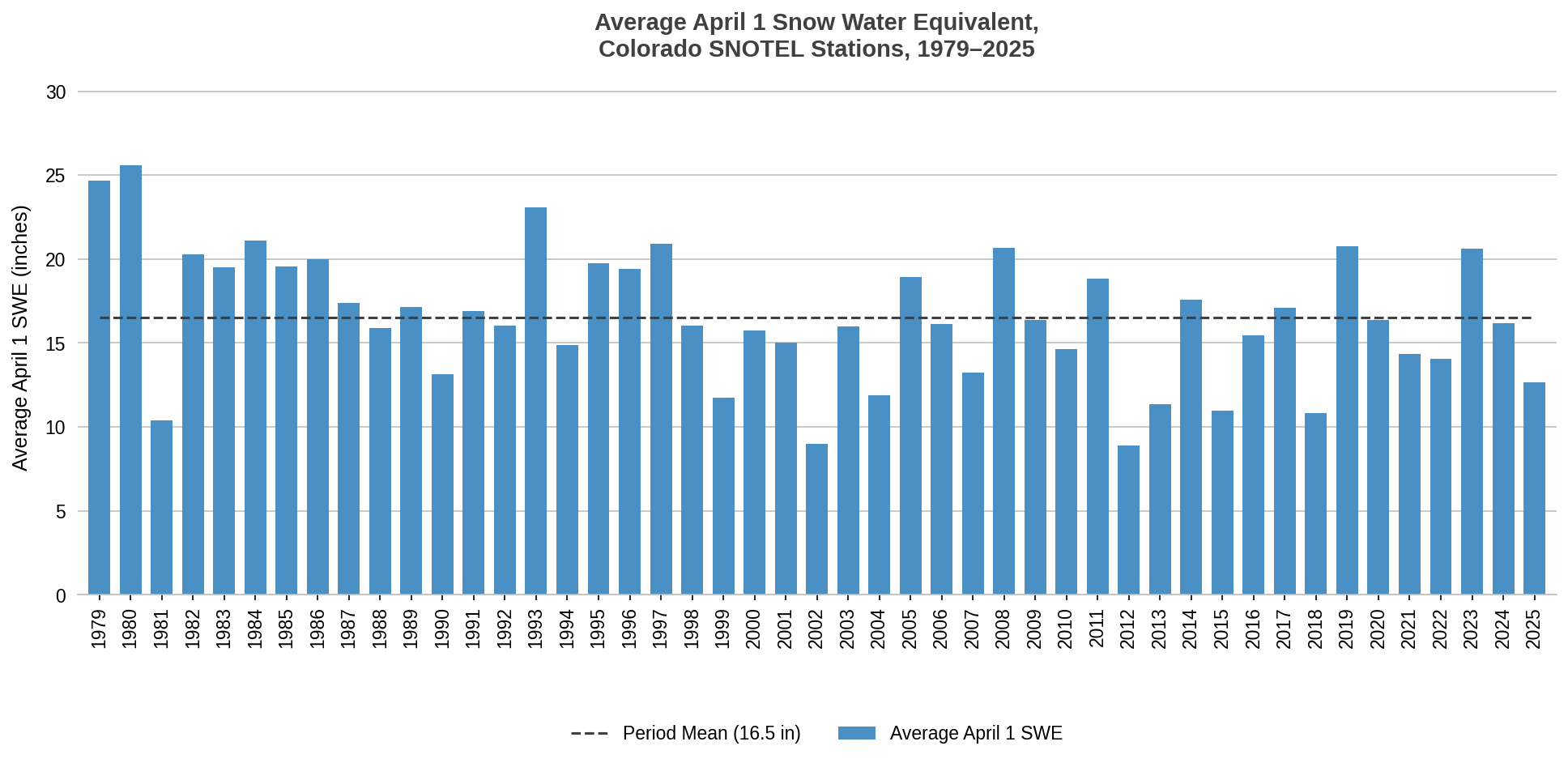 Figure 2: Average April 1 Snow Water Equivalent, Colorado SNOTEL Stations, 1979–2025. Data from Natural Resources Conservation Service, SNOTEL Network, WTEQ Start of Day Values, accessed February 2026, https://www.nrcs.usda.gov/resources/data-and-reports/snow-and-climate-monitoring-predefined-reports-and-maps