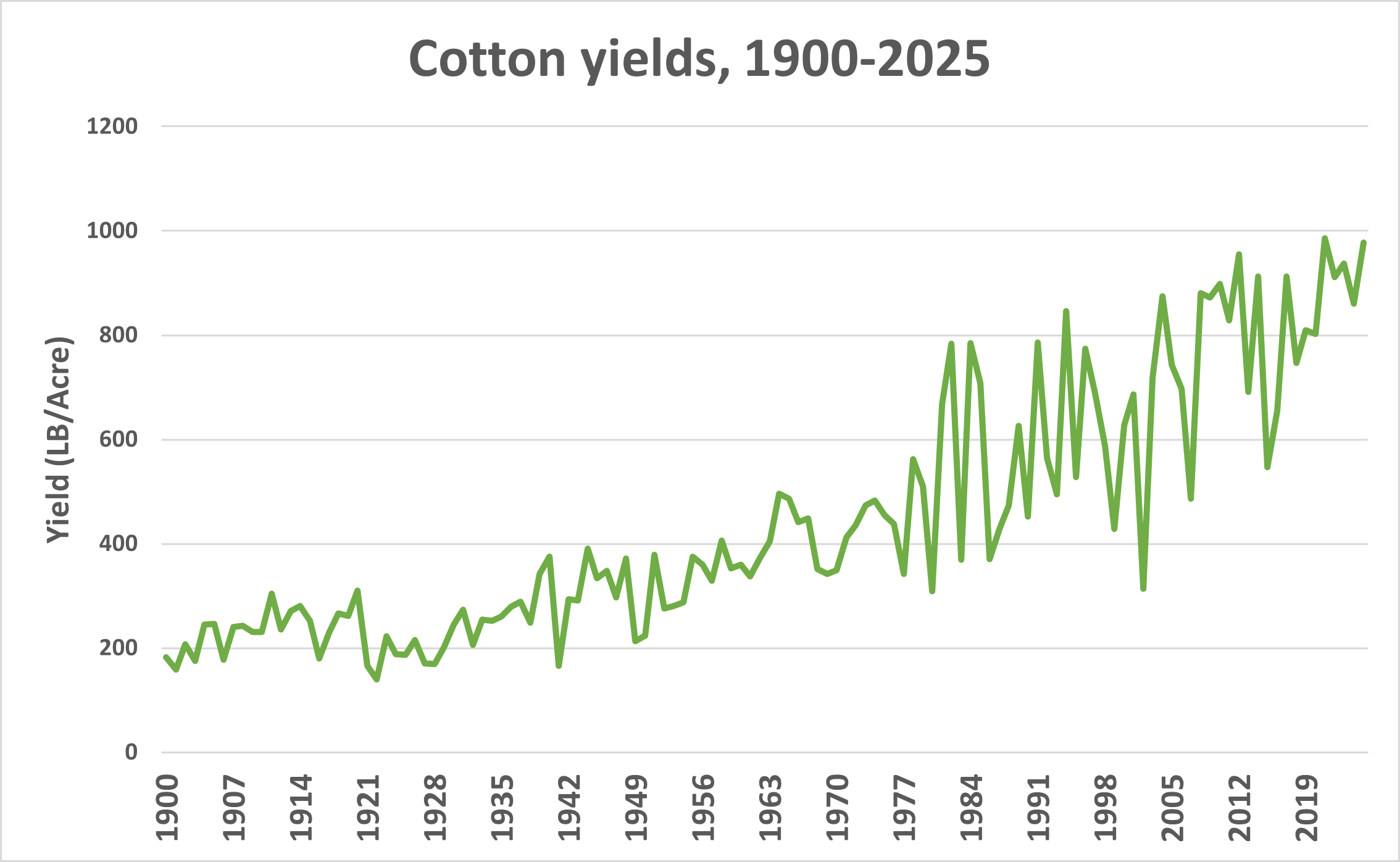 Figure 3: Cotton yields in South Carolina since 1900, measured in pounds per acre. Data from USDA QuickStats.