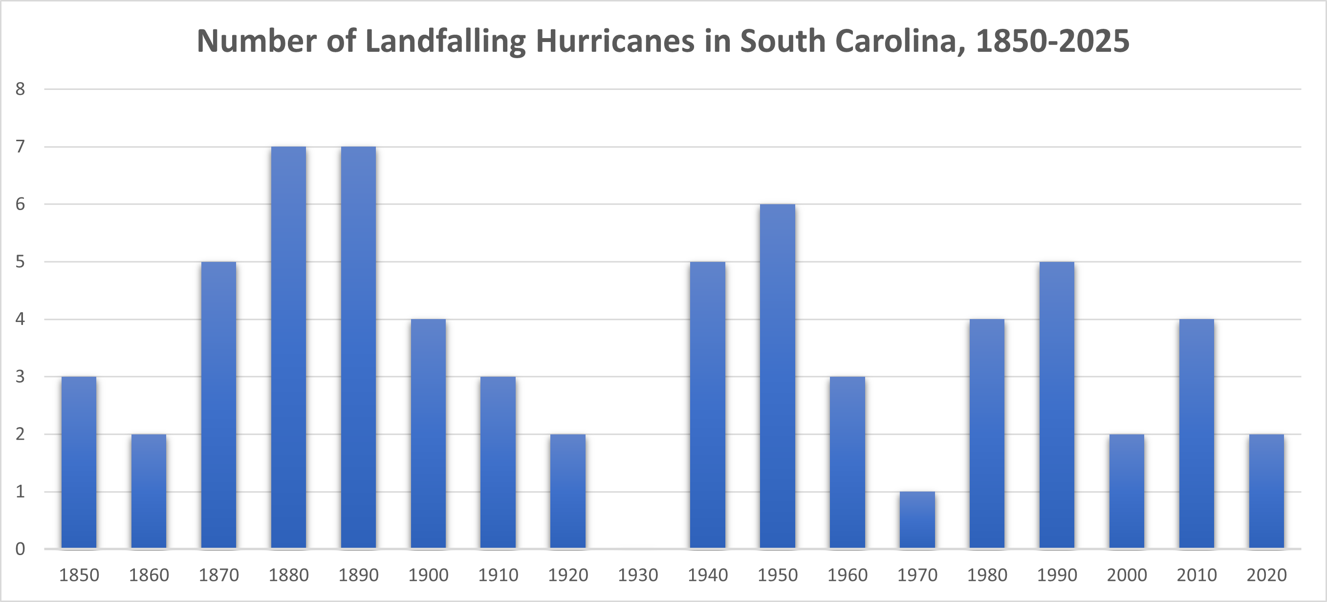 Figure 2: Count of landfalling hurricanes in South Carolina from 1850-2025. Data from NOAA Historical Hurricane Tracks HURDAT 2 database at https://www.climate.gov/maps-data/dataset/historical-hurricane-tracks-gis-map-viewer .