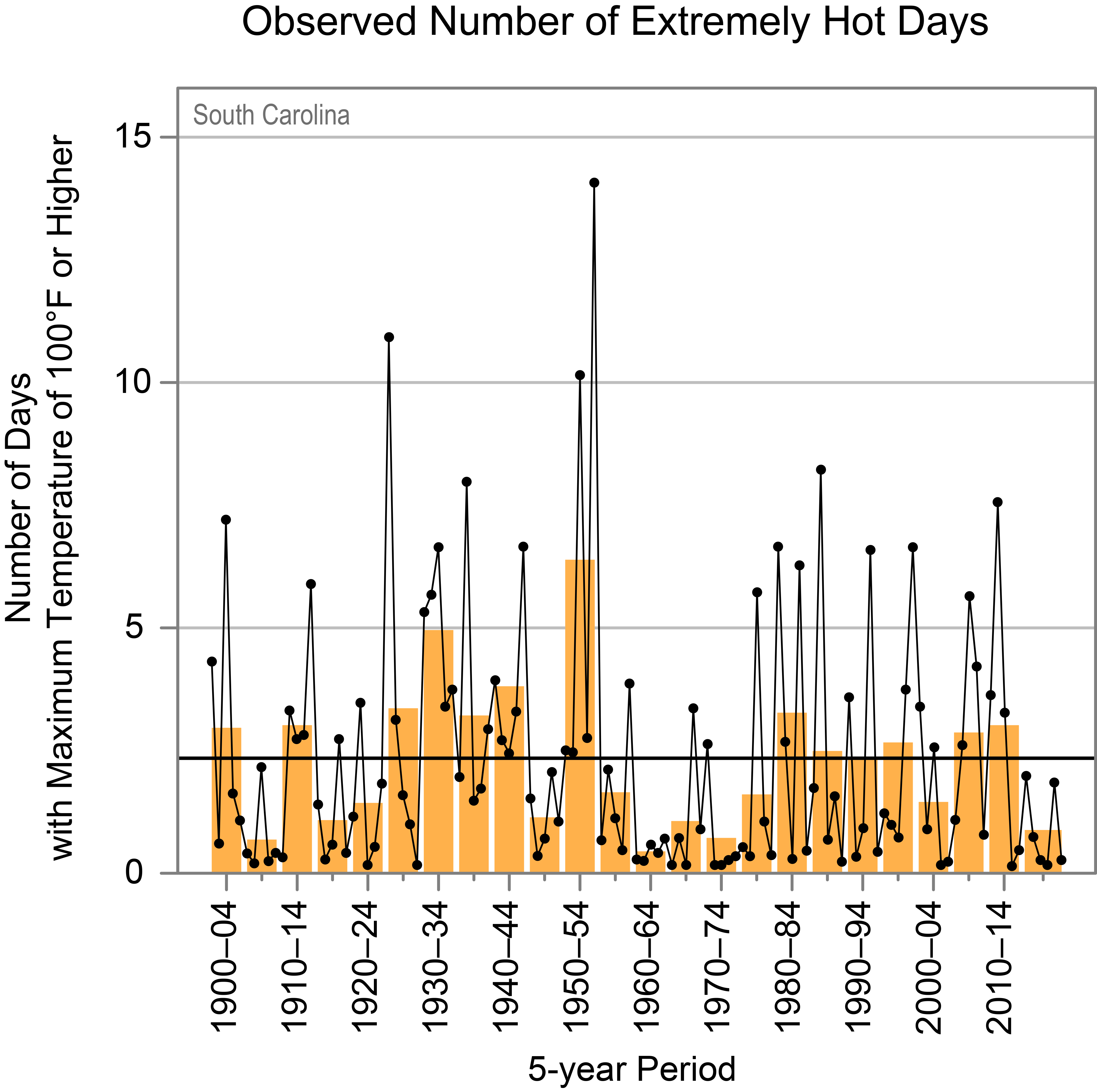 Figure 1: Observed number of very hot days in South Carolina since 1900. Dots are annual values. Orange bars show averages over a 5-year period, the last bar is a 6-year average. The horizontal black line shows the average of the entire period. Chart from Frankson, R., K.E. Kunkel, S.M. Champion, and D.R. Easterling, 2022: Ohio State Climate Summary 2022.