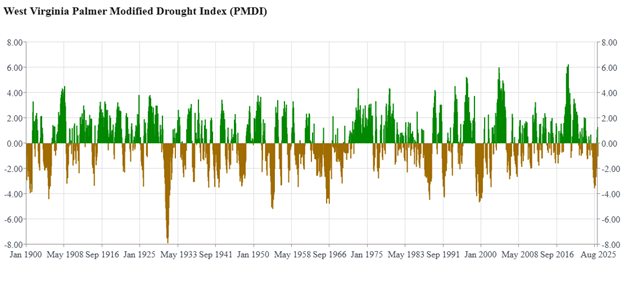 Figure 2: Palmer Modified Drought Index for West Virginia, 1900–present. Brown (negative) values show drought conditions; green (positive) values show wet conditions. Chart from NOAA National Centers for Environmental information Statewide Time Series.