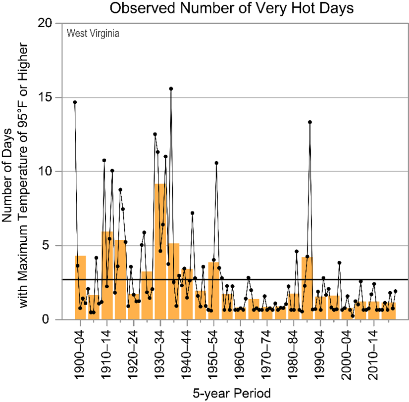 Figure 1: Observed number of very hot days in West Virginia since 1900. Dots are annual values. Orange bars show averages over a 5-year period, the last bar is a 6-year average. The horizontal black line shows the average of the entire period. Chart from Runkle, J., K. E. Kunkel, R. Frankson, B. C. Stewart, and J. Spaccio. West Virginia State Climate Summary 2022.